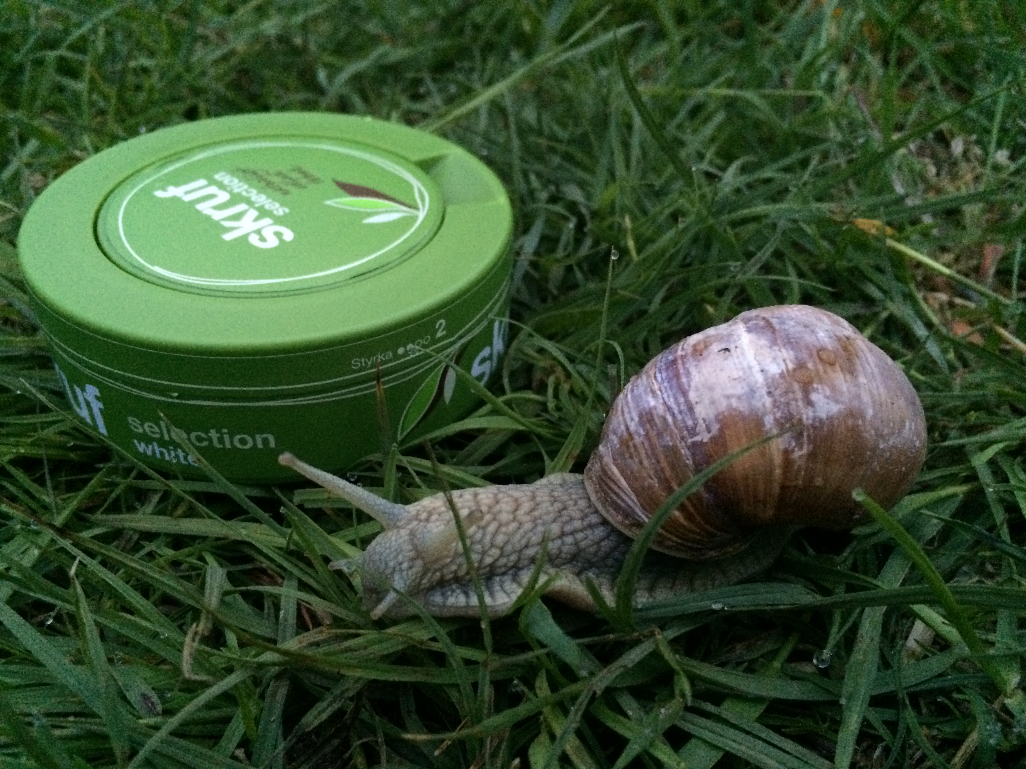 En äldre bild på en Vinbergssnäcka. Liten, men inte mindre slemmig för det.